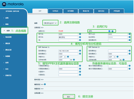 摩托罗拉IP9980-20PGW手动注册使用方法曹总步骤如下: